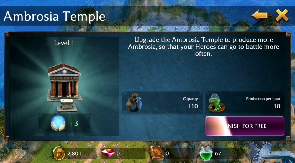 Veti controla un erou si chema o serie de minioni, cu care veti darama turnuri si ucide inamici. Zeii Olimpului va vor oferi tutoriale si evident avem si o baza pe care o putem dezvolta. Unitatile noastre includ sulitas, arcas, meduza, minotaur, hidra, grifon si sirena, dar dureaza ceva pana le deblocati pe toate. Currency-urile sunt de 4 feluri, inclusiv aur, gems, o licoare verde si carti.