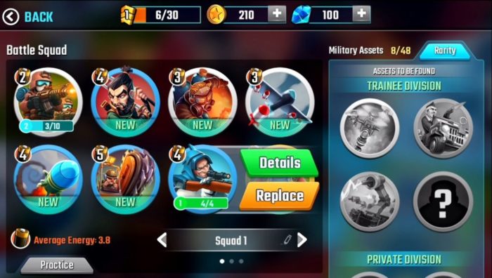 Putem să le upgradăm şi din când în când primim cufere pe care le deblocăm, dacă aşteptăm 4 ore sau chiar 12 ore, pentru a primi cărţi de joc cu personajele. Mai multe cărţi strânse înseamnă upgrade, precum… ştiţi voi, jocul ăla de la SuperCell. Îmi place cum sunt desenate acele mici drone, dar şi sniperul şi lansatorul de flăcări arată binişor.