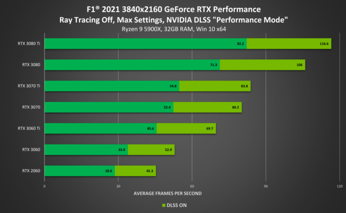 Cu o creștere a performanței de până la 65% în F1 2021, fiecare placă video GeForce RTX poate rula la 60 FPS+ în 1440p cu ray tracing pornit, iar GeForce RTX 3070 sau mai sus pot rula la 60 FPS în 4K cu setări maxime și ray tracing pornit. Cu DLSS și ray tracing, jucătorii care folosesc GeForce RTX beneficiază de o experiență incomparabilă în F1 2021 – cu umbre și reflexii ray-traced, dar și cu un număr crescut de cadre pe secundă fără a sacrifica calitatea imaginii datorită DLSS.
