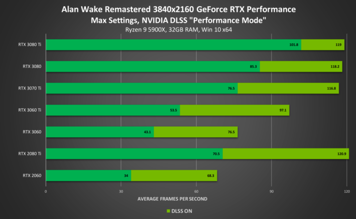 - Alan Wake Remastered (5/10) – NVIDIA DLSS oferă performanță până la 2x în 4K. Fiecare placă video GeForce RTX poate ajunge la 60FPS, cu setări maxime în 4K cu NVIDIA DLSS pornit în Alan Wake Remastered.