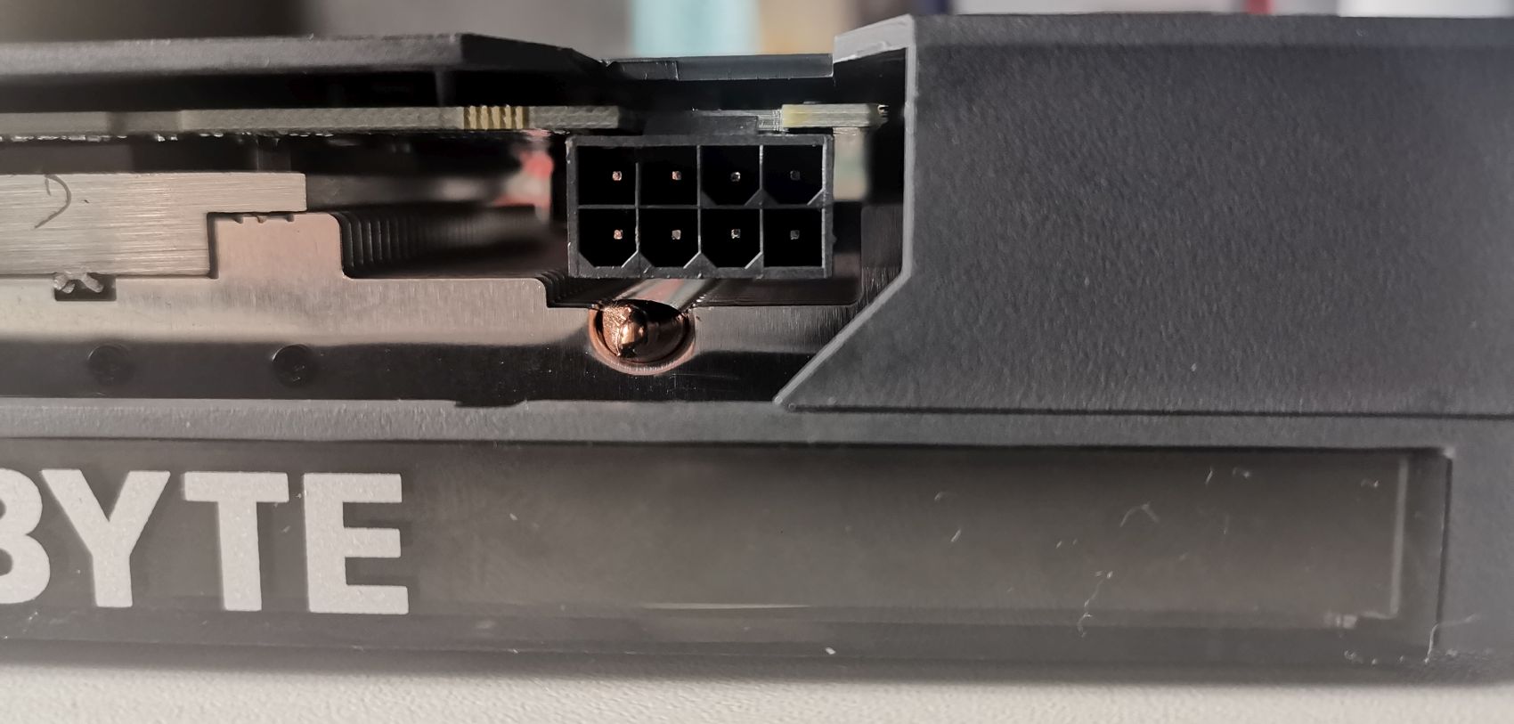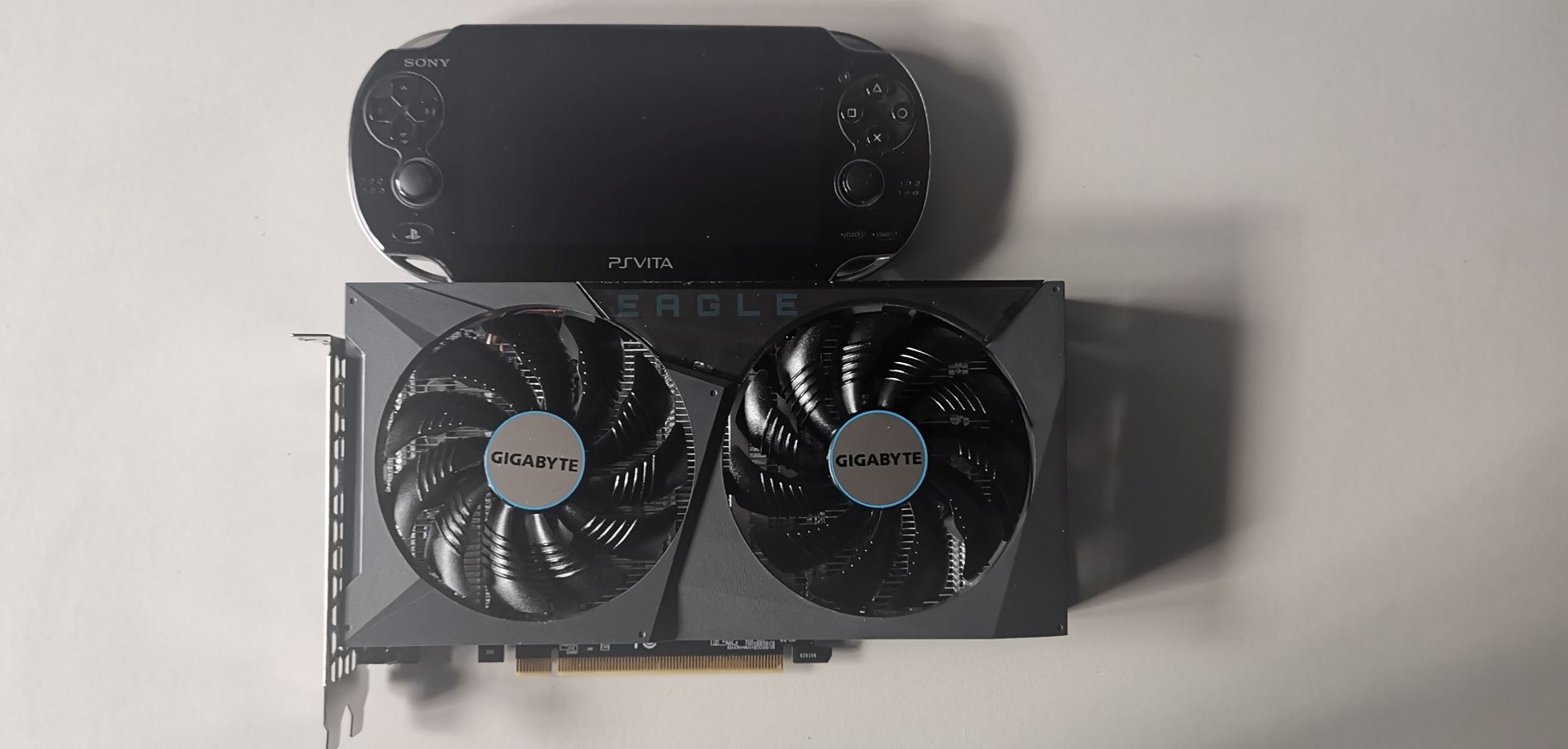 Placa e destul de compactă, mai ales dacă alegi versiunea Gainward cu doar un ventilator, dar nici a noastră nu e foarte mare. E cam cât un PS Vita şi încă o treime. Are un conector singular de 8 pini pentru alimentare şi consuma un maxim de 130W (rivalul AMD 6500 XT e totuşi pe la 90W), deci te descurci şi cu surse de 500W-550W.