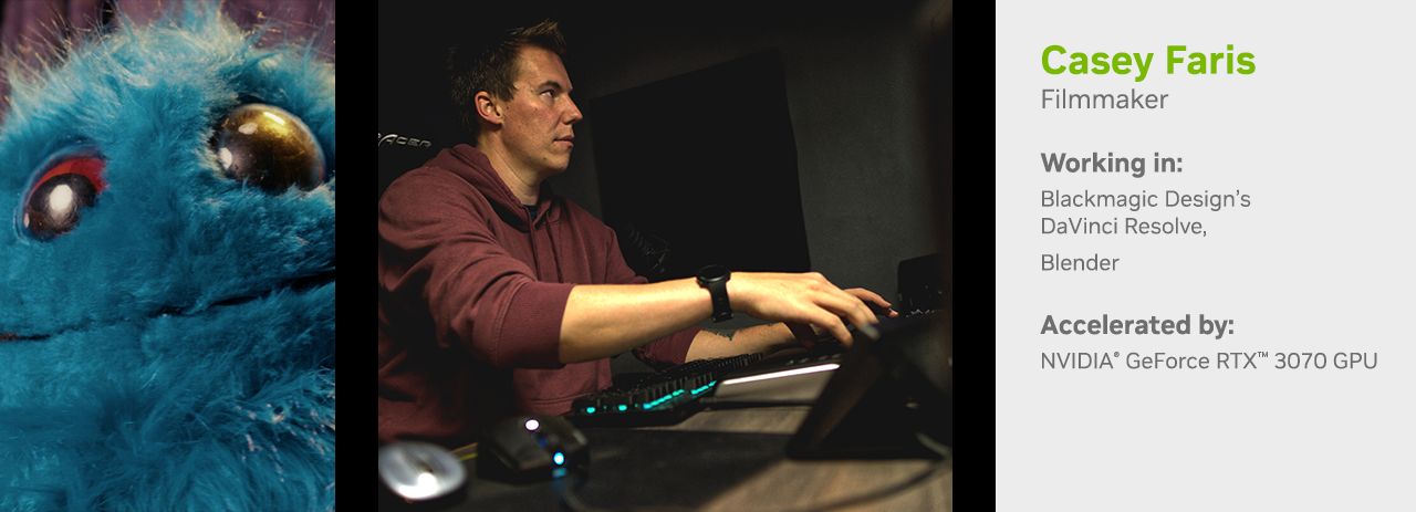 Casey Faris și echipa de la Release the Hounds! Studio au folosit plăci video RTX pentru a crea scurtmetrajul sci-fi Tuesday on Earth. Cu ajutorul plăcilor video RTX, Faris a putut edita mai repede, a putut grăbi procesul de retușare a culorilor și a putut implementa efecte speciale demne de Hollywood în DaVinci Resolve.