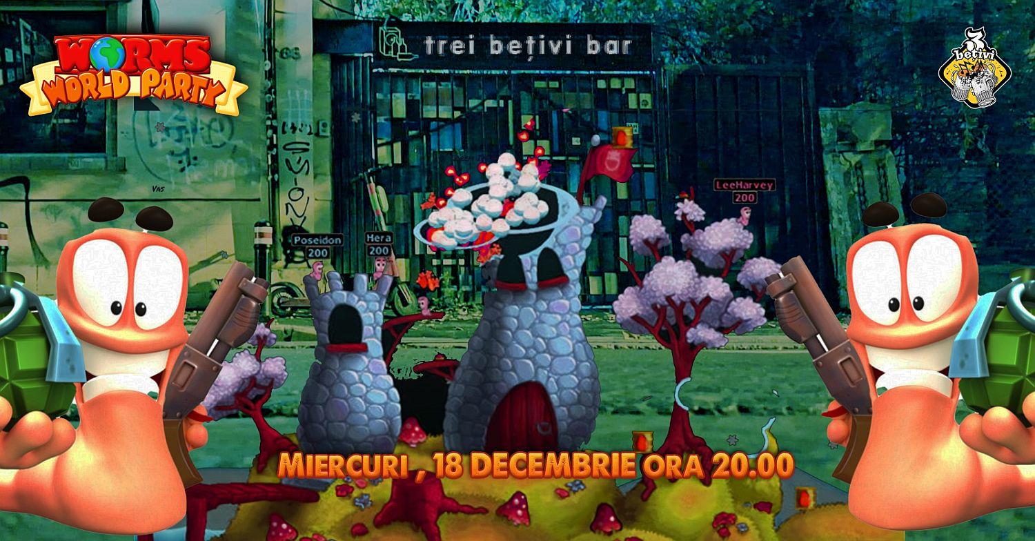 Campionat! Cu Locuri 1, 2, 3 și cu premii, normal. Worms World Party pune în confruntare două echipe de viermi cu cele mai delulu arme și atacuri.