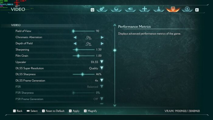 Tehnologiile cheie ale NVIDIA DLSS 4 sunt prezente, inclusiv Multi Frame Generation, Super Rezoluție și DLAA cu modele noi de AI Transformer și Reflex.