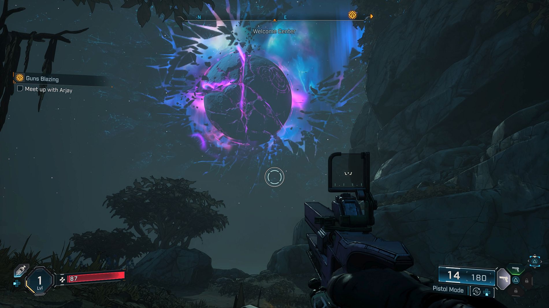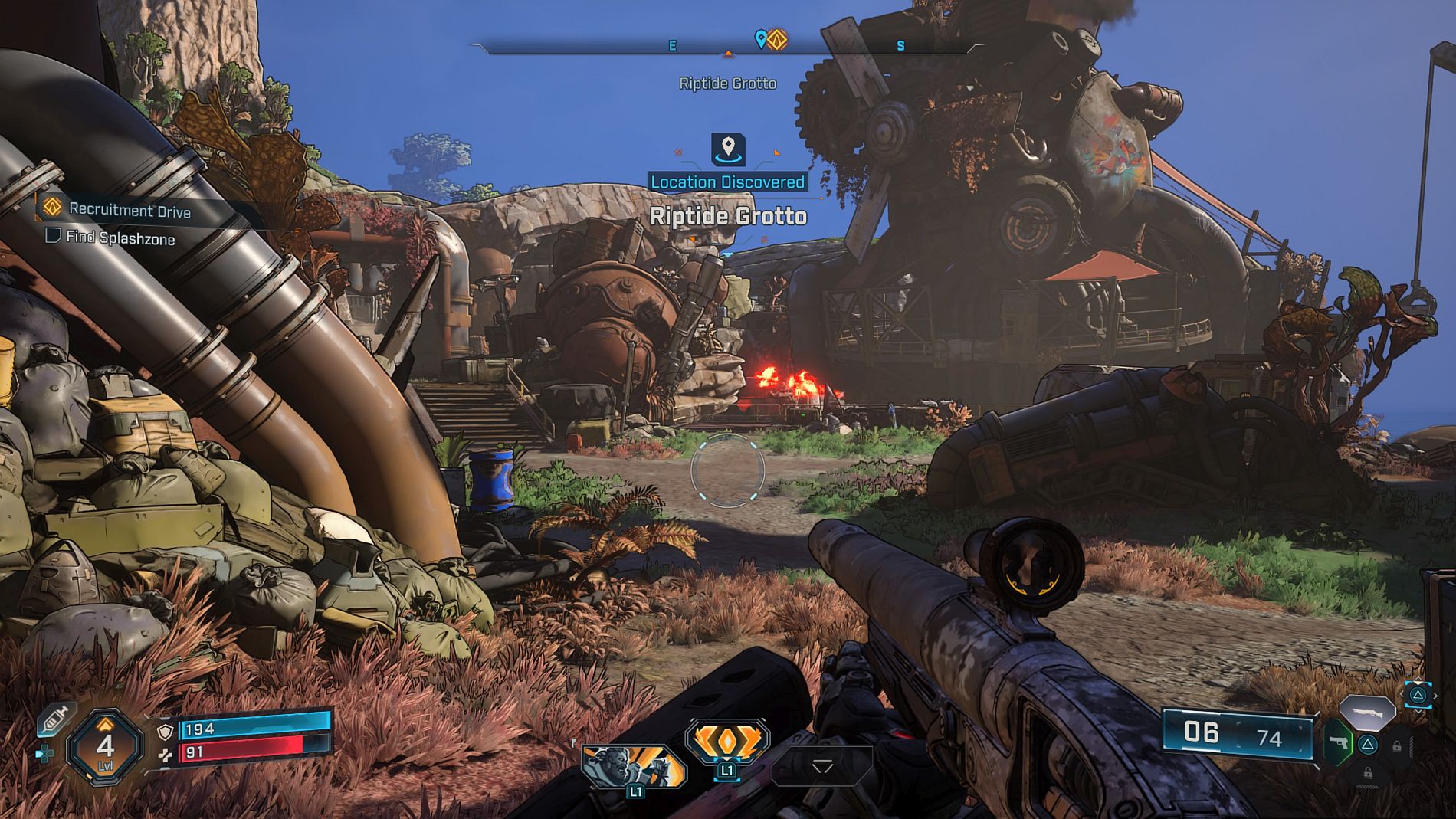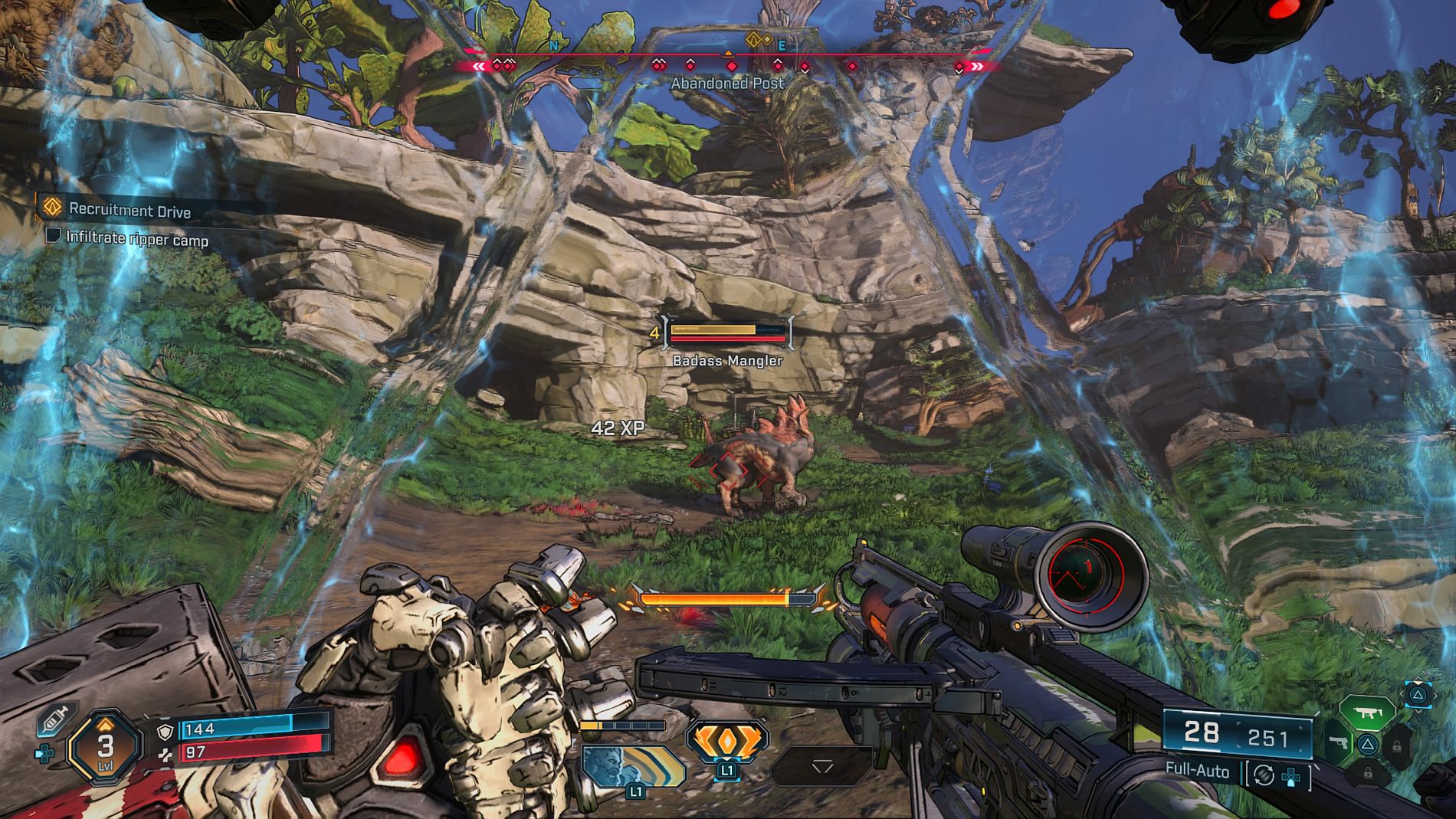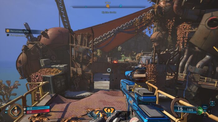 Amon al meu se repede cu scutul în inamici, aruncă cu el în ei când e gata atacul, trage cu bile de foc şi mai departe o să mai descopăr şi alte abilităţi. Jocul adevărat începe abia după ce iei scut, altfel eşti sitting duck. De ani întregi Borderlands înseamnă să tragi în ei, să îi stârneşti, să le dai o salvă de gloanţe, apoi să fii lovit crunt de inamici şi să te retragi în cover pentru a îţi reface scutul.