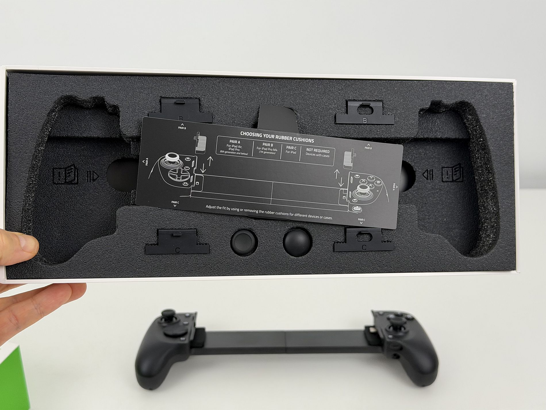 Corpul e masiv, însă ergonomia rămâne surprinzător de bună. Brațele telescopice se extind lin și se fixează ferm pe marginea tabletei, iar bracket-urile laterale cauciucate asigură o prindere sigură fără să zgârie rama. Materialele sunt la standardul Razer – plastic mat, textură cauciucată pe mâner, curbe confortabile care se potrivesc natural în palmă. În cutie primești bracket-uri de dimensiuni diferite, utile dacă folosești o husă, și capace interschimbabile pentru thumbstick-uri, care pot fi înlocuite în funcție de preferințele de aderență sau înălțime.